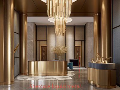 液態(tài)金屬能應用到酒店哪方面裝飾?液態(tài)金屬可以用于大堂的裝飾元素,如立柱、墻面、天花板等,為酒店營造...